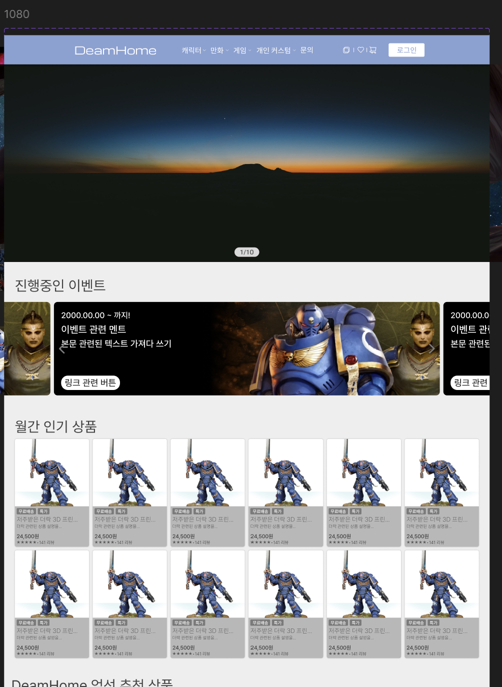 이전 포스터 Front-end) 프로젝트 아토믹 디자인 패턴 적용이전 포스트 Front-end) 프로젝트 설계 및 기초 세팅쇼핑몰 기능 구상1. 메인 화면HeaderLogo카테고리캐릭터만화게임개인커스텀문의간편 메